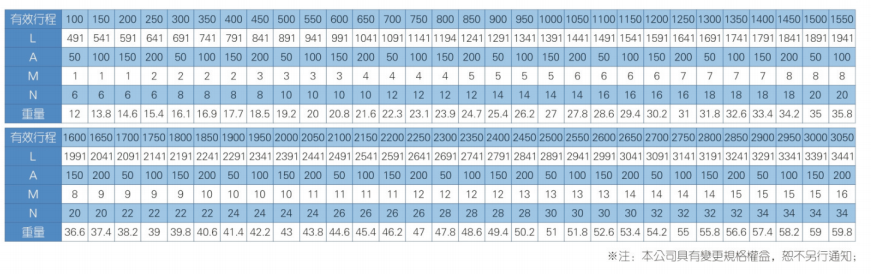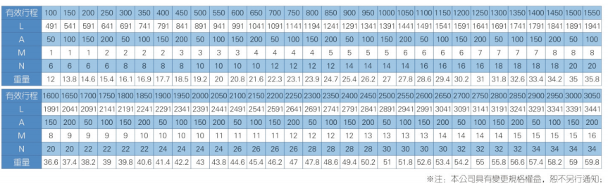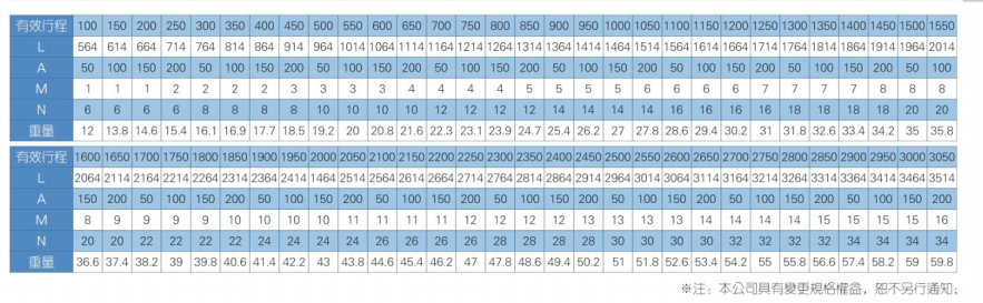 2、螺杆转速超过临界转速时可能发生共振,临界转速和螺杆长度有关,故滚珠螺杆的临界转速也间接决定了滑台模组的有效行程和总长度,有效行程和常用螺杆规格转速的关系如下列表格。