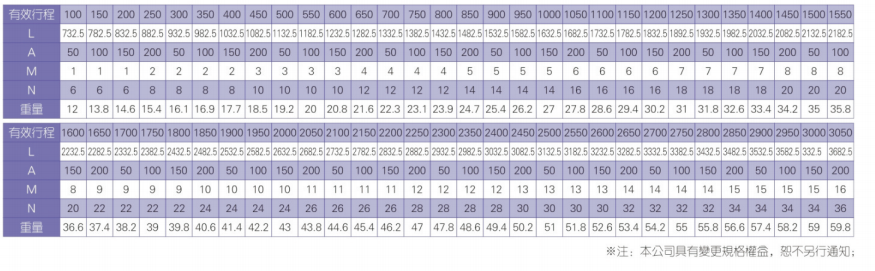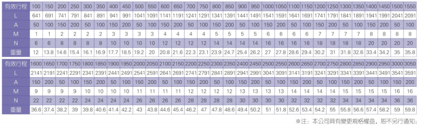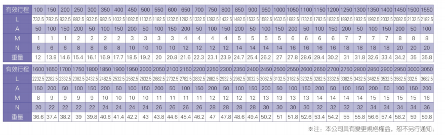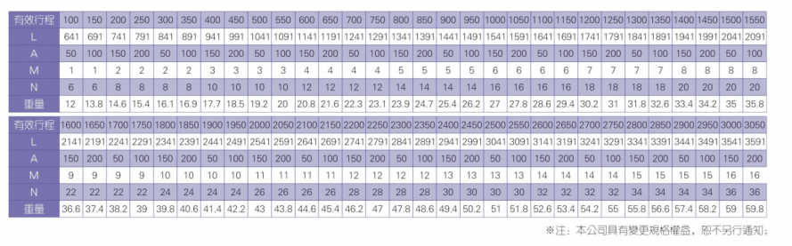 2、螺杆转速超过临界转速时可能发生共振,临界转速和螺杆长度有关,故滚珠螺杆的临界转速也间接决定了滑台模组的有效行程和总长度,有效行程和常用螺杆规格转速的关系如下列表格。