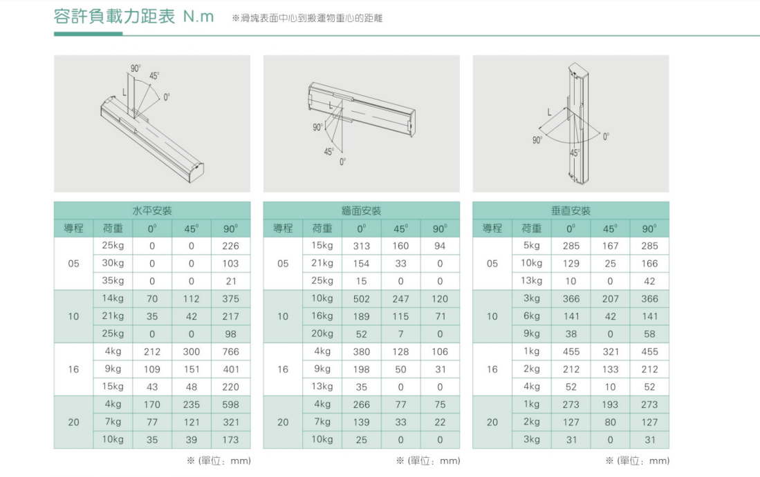 3、加减速度会使搬运质量产生惯性负荷,加减速度越大可搬运质量会越小;而且过大的加减速度会产生较大的重势力,设计时需纳入考量规范。