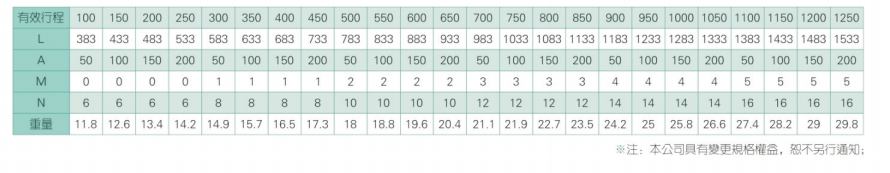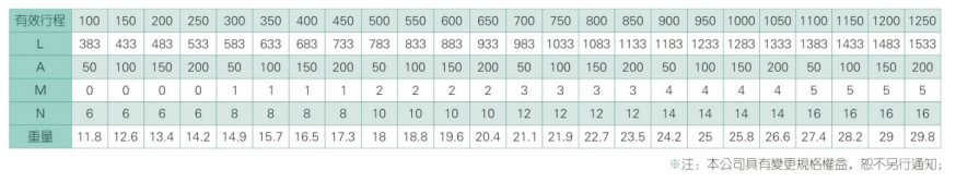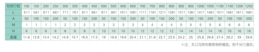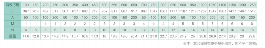 2、螺杆转速超过临界转速时可能发生共振,临界转速和螺杆长度有关,故滚珠螺杆的临界转速也间接决定了滑台模组的有效行程和总长度,有效行程和常用螺杆规格转速的关系如下列表格。