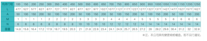 2、螺杆转速超过临界转速时可能发生共振,临界转速和螺杆长度有关,故滚珠螺杆的临界转速也间接决定了滑台模组的有效行程和总长度,有效行程和常用螺杆规格转速的关系如下列表格。